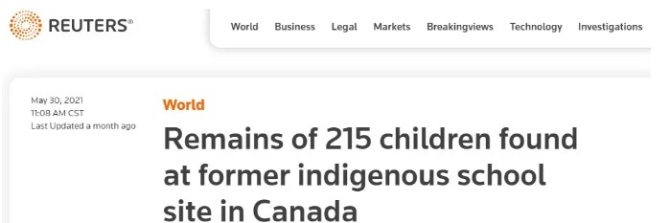 5月底,加拿大不列颠哥伦比亚省坎卢普斯市一所原住民寄宿学校旧址惊现215具原住民儿童遗骸,其中最小的孩子年仅3岁,这一发现震惊了国际社会。