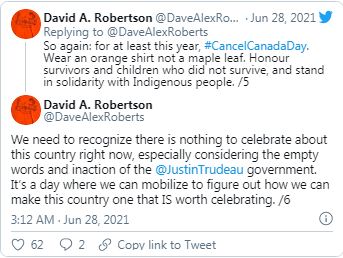 尤其讽刺的是,7月1日是加拿大的国庆日,但近期接二连三发现的无标记坟墓让加拿大原住民组织和社区几乎一致拒绝庆祝这个节日。加拿大原住民小说家大卫·罗伯逊在社交媒体上发文批评加拿大政府:“考虑到特鲁多政府的空头承诺和不作为,当下我们没什么好庆祝的。”