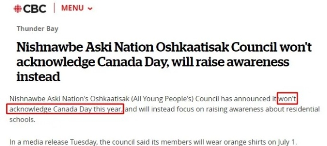 安大略省北部奥什卡蒂亚克原住民社区理事会表示,该机构不承认加拿大国庆日,并选择在7月1日身着橙色服装,以展示该国原住民寄宿学校制度的“可耻历史”以及这段历史残留至今的有害糟粕。