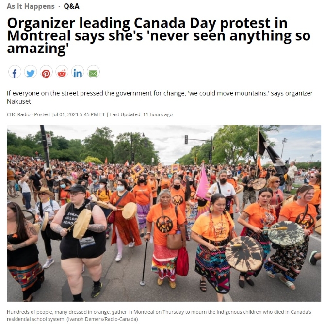 在多个社交媒体平台牵头发起“取消加拿大国庆日”抗议活动的加拿大原住民权益组织“不再无所作为”表示,该组织不会为殖民者“窃取的土地与生活”进行庆祝,相反,该组织将举行大规模的抗议活动,以缅怀那些原住民受害者。