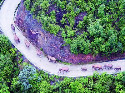 7月1日,北移象群在云南省玉溪市峨山县塔甸镇附近道路上迂回移动。云南省森林消防总队供图