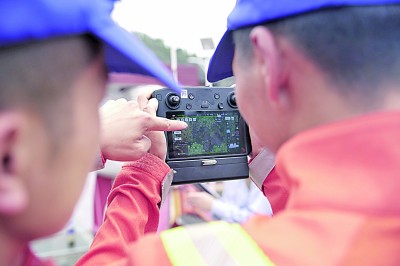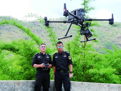 云南玉溪巡特警支队民警在易门县南山村操作无人机监测700米外的北移象群。本报记者 张勇/摄
