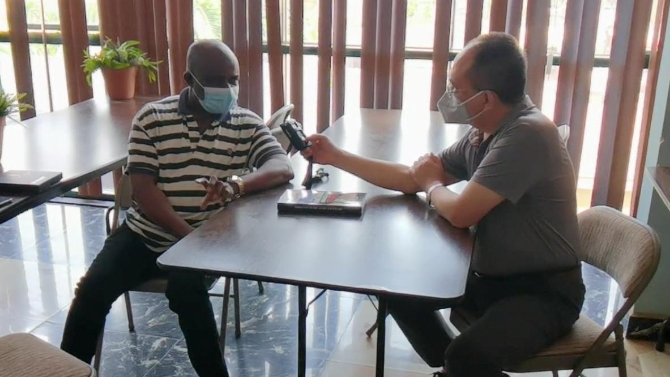 △伊肯纳·艾梅乌(左)接受总台记者采访