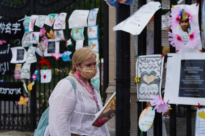 6月14日,一名女子在美国纽约一处墓地外为新冠死者设立的纪念装置旁驻足。新华社记者王迎摄