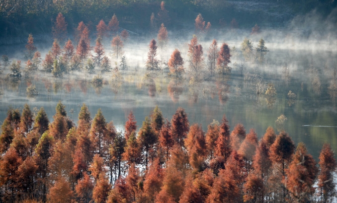 水鸟游过清晨薄雾中的云南省昆明市盘龙区滇源街道甸尾村水杉湿地(资料照片)。新华社记者 秦晴 摄