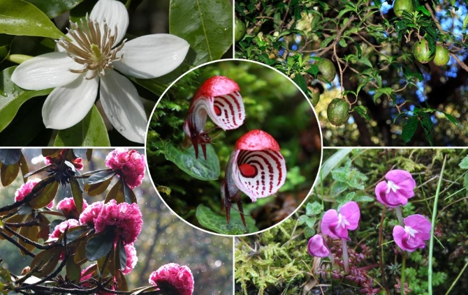 这张拼版照片显示的是高黎贡山国家级自然保护区的部分野生植物,左上为长蕊木兰,左下为大树杜鹃,中间为大理铠兰,右上为保山茜,右下为矮马先蒿(资料照片)。新华社发(高黎贡山国家级自然保护区保山管护局供图)