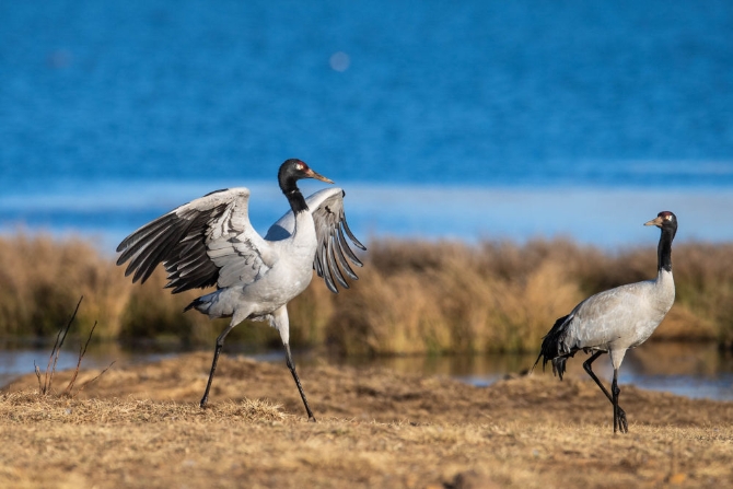 黑颈鹤在云南省昭通市大山包大海子湿地嬉戏(2月24日摄)。新华社记者 胡超 摄