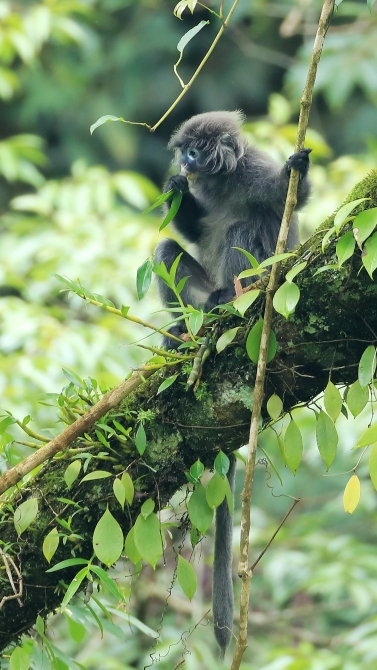 菲氏叶猴身披极具高级感的青灰色毛,拖着长长的尾巴,这也是它们的显著特征之一,长尾巴就是它们完成丛林穿越重要的“平衡器”。它们还有深邃的圆眼,与众多猴科亲戚相比,算是长了一张“娃娃脸”。它们眼周、口鼻部因为缺少色素而呈现浅色,与全身的青灰色反差非常大,极具辨识度。