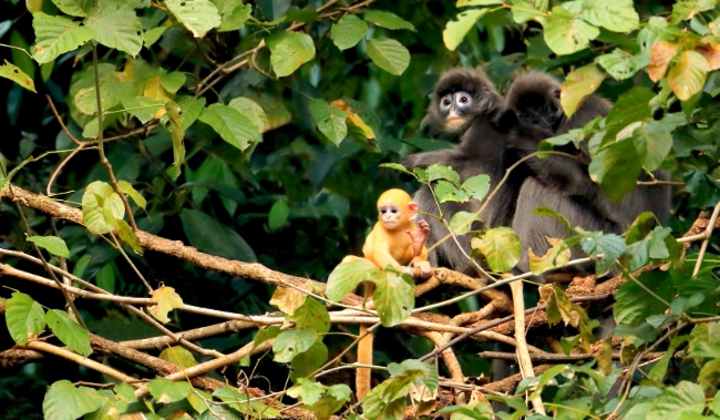 菲氏叶猴是国家一级重点保护野生动物,以树叶、果子为主食,很爱干净,具有团队精神,转场时会排队有序离开,成年猴还会抢着抱猴群里的幼猴。菲氏叶猴猴宝宝刚出生时全身金黄,大约在3个月大时尾巴和头部毛色逐渐开始变灰,在德宏州芒市轩岗乡,这个全国菲氏叶猴最大种群栖息地,村民们亲切地把它们称作“菲菲”。