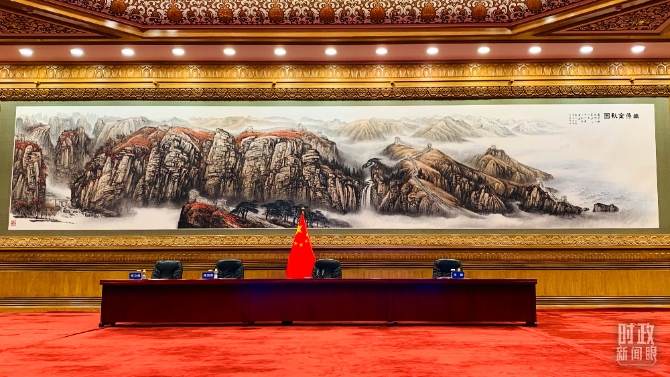 北京人民大会堂,视频峰会开始前的会场。(总台央视记者范一鸣拍摄)
