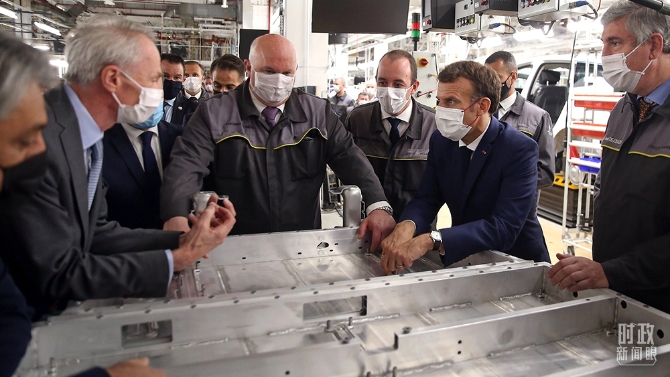 △2021年6月28日,马克龙(右二)在参观法国北部城市杜埃附近的工厂时,对中国企业将在这里投资建设电池工厂表示欢迎。(图/视觉中国)