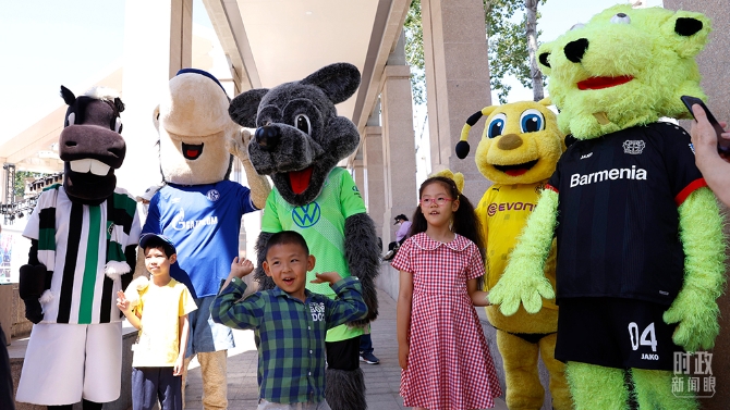 △“走进德国 2021北京站”活动今年5月在北京朝阳区开幕,孩子们与多家德国足球俱乐部的吉祥物合影。(图/视觉中国)