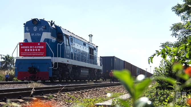 △2021年4月21日,一列满载防疫物资的中欧班列,由厦门海沧站发往德国杜伊斯堡。(图/视觉中国)