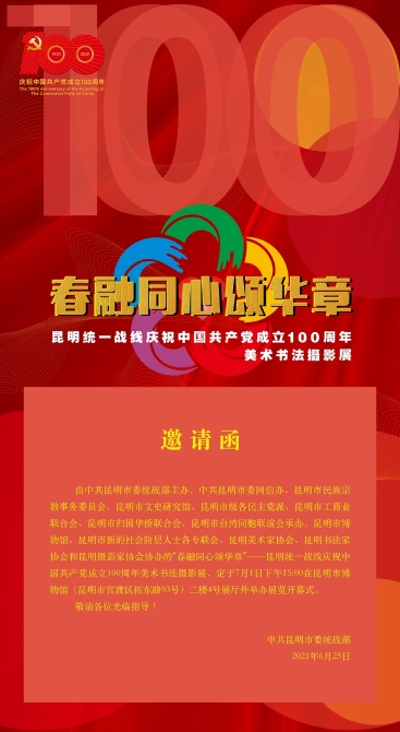 百年征程波澜壮阔,百年奋斗日月同辉。为庆祝中国共产党成立100周年,深入学习贯彻习近平新时代中国特色社会主义思想,深刻总结党领导统一战线的光辉历史,展示统一战线广大成员听党话、跟党走、感党恩的精神风貌,7月1日起至15日,“春融同心颂华章”——昆明统一战线庆祝中国共产党成立100周年美术书法摄影展在昆明市博物馆4号展厅和国际艺术空间隆重举办。