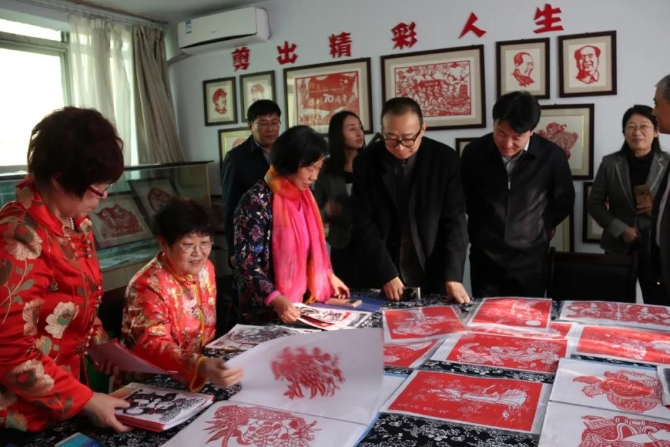 2018年4月4日,在青岛市西海岸新区隐珠街道台兴路社区调研民间剪纸工艺进社区