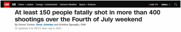 CNN称,上述数据包括从上周五(7月2日)至上周日(7月4日)的72小时内、全美范围内枪击事件和枪支暴力受害者的数量,并且数据仍在不断变化更新。