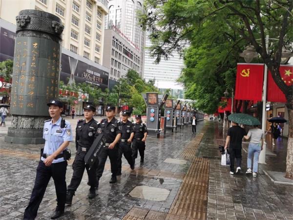 南屏步行街是昆明的中心坐标,无论是昆明人、还是外地人,或都耳濡目染、或都心驰神往。6月的盛夏,给了南屏街一抹生机的绿色,沿街的党旗国旗迎风飘扬显得格外显眼,街上有身着蓝色、黑色制服的护国派出所民辅警,也有头顶小红帽、身着红T恤、手戴红袖标的治安志愿者,他们用“警察蓝”和“志愿红”与大自然一道,共同为党和人民绘就了一幅色彩斑斓的平安画卷。
