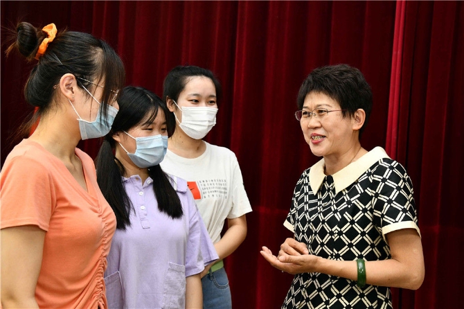 在山东潍坊学院法学院,全国人大代表高明芹(右一)在宣讲《民法典》相关内容(2020年6月16日摄)。新华社记者 郭绪雷 摄