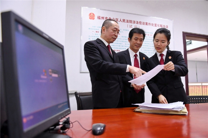 福建省福州市仓山区人民法院工作人员李扬(右)和同事在研究处理12368诉讼服务热线的群众意见(2019年1月17日摄)。服务热线主要负责法律咨询、案件查询、联系法官、收集意见建议等,为人民群众提供精准、便捷的服务。新华社记者 林善传 摄