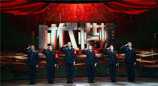 福建省“漳州110”成员代表在“时代楷模”发布仪式上敬礼(1月4日摄)。“漳州110”是人民群众对福建省漳州市公安局巡特警支队直属大队的简称。自1990年8月成立以来,这个代号守护了当地百姓30余年。新华社记者 潘旭 摄