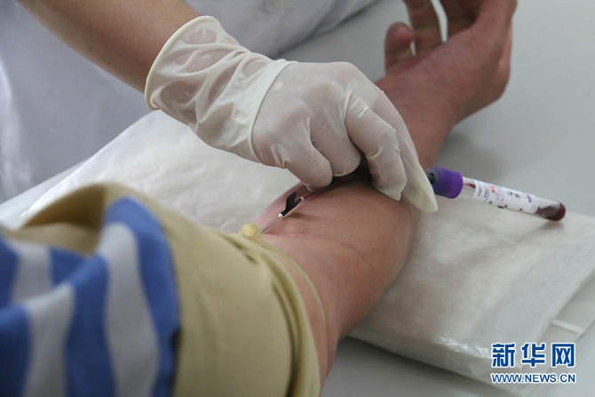 小龙潭监狱中心医院收治的服刑人员,以传染性疾病居多,职业暴露的风险很高,特别是在对肺结核、艾滋病患者进行救治的时候,一不小心就可能被感染。图为医生为服刑人员抽血体检。新华网发(念新洪/文 锡乐/摄)
