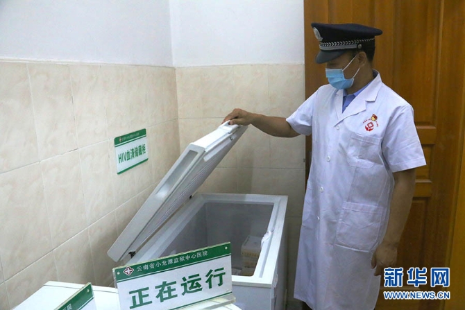 因为“高墙医生”的特殊性,33年来,不断有亲朋好友劝桂家华换一份工作,但他却毫不动摇,“再难的工作,也要有人做,作为一名党员、一名医者、一名警察,我不能退缩。”图为桂家华在检查HIV血清储藏柜运行情况。新华网发(念新洪/文 锡乐/摄)