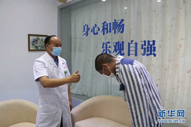 在桂家华看来,相比身体上的疾病,服刑人员的心病更难医治。因此,在工作中他既注重治病,又注重医“心”。图为桂家华与一名服刑人员谈心,鼓励他重拾希望,好好接受治疗和改造。谈话结束后,服刑人员对桂家华鞠躬致谢。新华网发(念新洪/文 锡乐/摄)