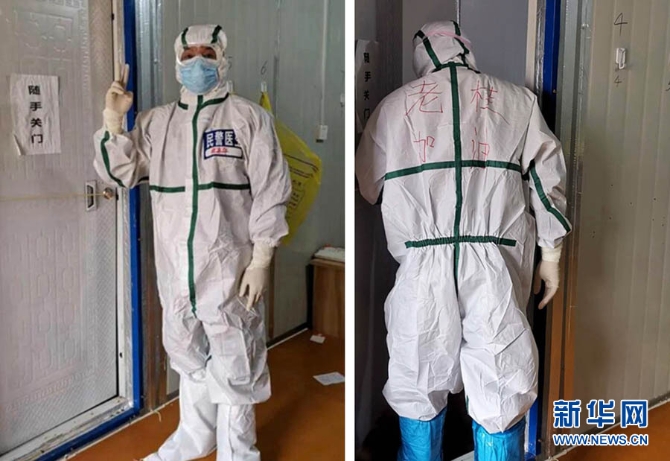2020年2月,面对突如其来的新冠肺炎疫情,年过五旬,且已经连续封闭执勤了20余天的桂家华,响应医院号召,白衣执甲,赶赴湖北武汉。图为桂家华身穿防护服,战斗在抗疫一线。新华网发(念新洪/文 受访者供图)