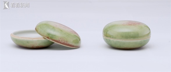 这位“孪生姊妹”外形并无二致,却呈现出绿釉色调,仅盖面局部有红色。她的釉色晶莹,清新淡雅如苹果绿,好似萌发一个春天的绿意。清甜薄荷绿加之精致小巧的外形,酷似法式甜点马卡龙。