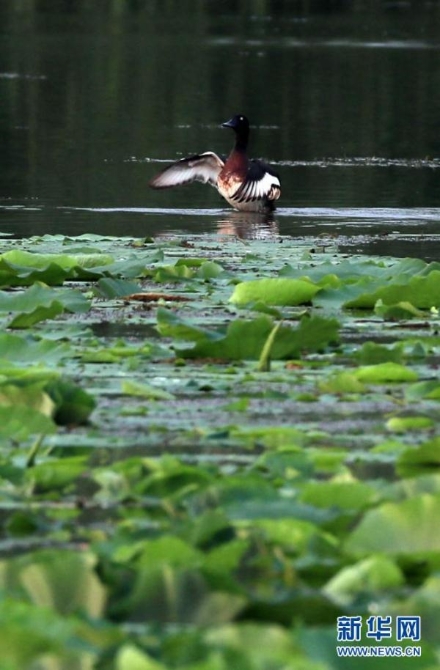 青头潜鸭在民权县黄河故道国家湿地公园栖息(7月7日摄)。
