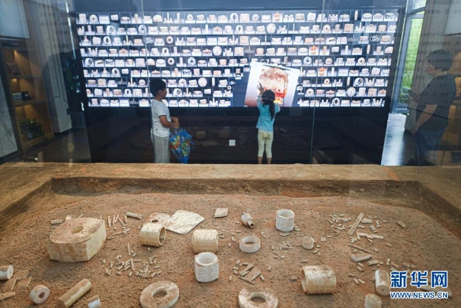 拼版照片:这是良渚文化遗址出土的(上排左起)黑陶器、玉琮、木屐、(下排左起)漆器、陶片和玉璧。新华社记者 翁忻旸 摄
