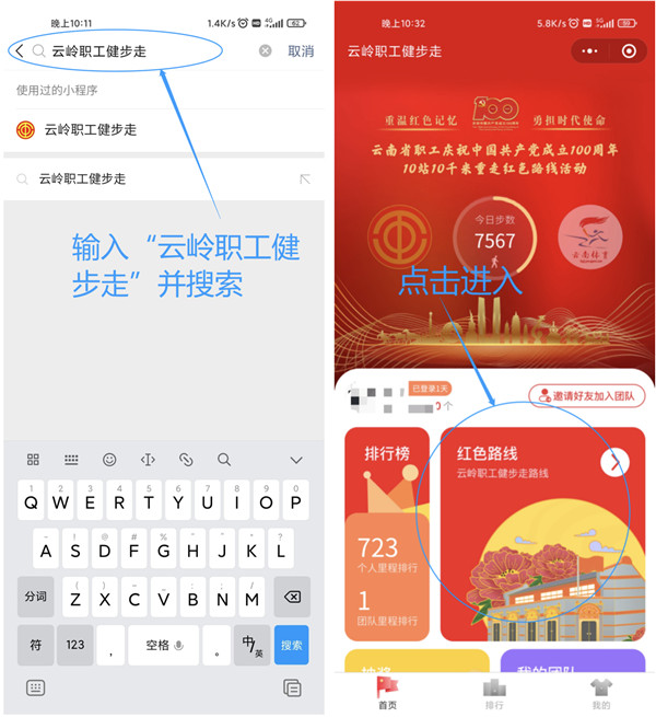 第一步:微信搜索打开“云岭职工健步走”小程序,并点击红色路线活动;