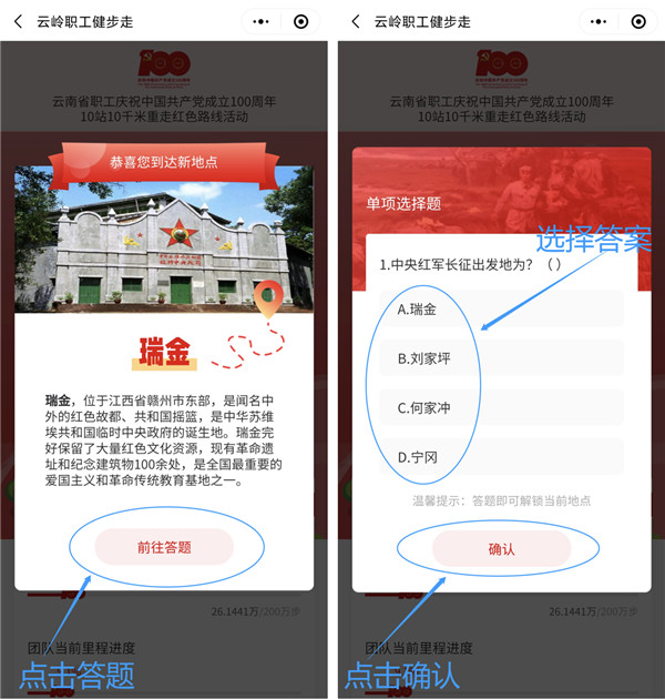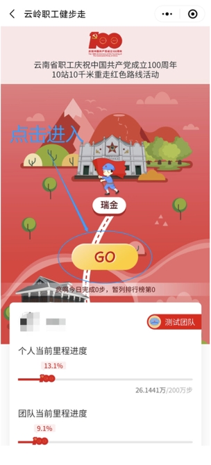 本次活动以“重温红色经典勇担时代使命”为主题,由云南省总工会主办。通过微信小程序健步打卡,参与党史答题游戏互动,点亮虚拟“红色”地标。累计健走步数,最终点亮所有“红色地标”完成红色路线,可获得丰富好礼。本次活动特别设置团队奖和个人奖,智能手表、无线耳机、运动手环、投影仪等丰富礼品走路即有机会获得。