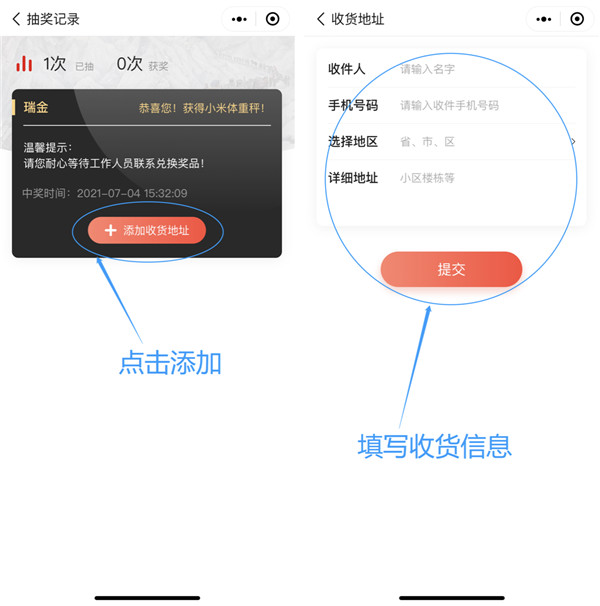 第六步:中奖后点击查看详情,添加收货地址并提交,就可以坐等奖品到家啦;