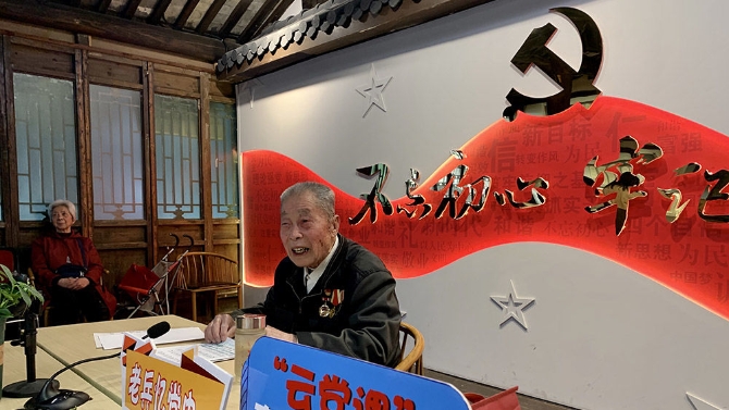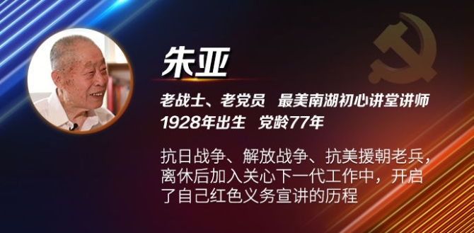 红船边,有战争年代的老党员讲述峥嵘岁月。93岁的老党员朱亚,1939年参加革命,1944年入党,经历过抗日战争、解放战争、抗美援朝。离休后,又在1989年加入到关心下一代工作中,30多年来,他走遍了嘉兴的各大学校,向青年人讲述党史故事。