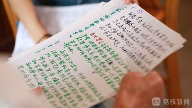 一见到蒋卓昀,朱亚便拿出了当时在红船边讲党课时用到的手稿。白色的纸上,一段文字用绿色水彩笔书写,另一段又改用黑色水彩笔书写,还有一些红笔勾画的重点。这么做的目的,是因为自己年纪大了,怕在讲课时看不清楚讲稿,低头读稿子又会影响课堂效果。