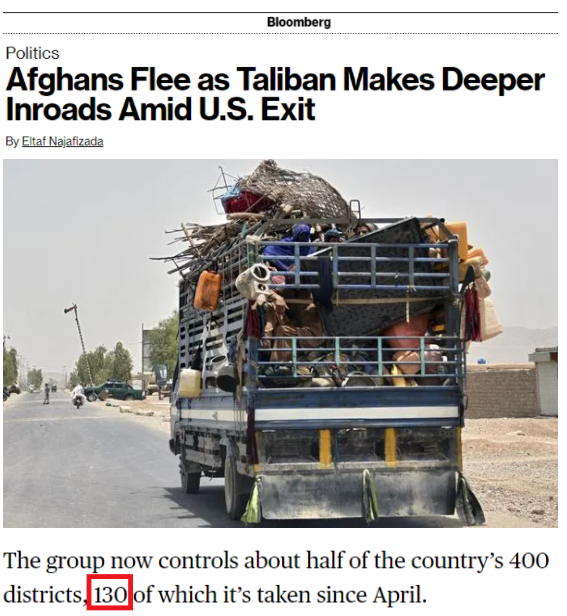 据彭博社6日报道,塔利班目前已经控制阿富汗400个地区中的约一半,其中有130个区域是4月美国宣布撤军以来夺取的。