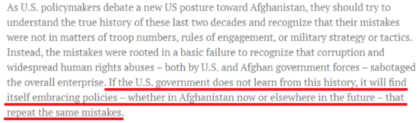 文章称,在这20年里,美国将短期军事利益置于建立民主机构和保护人权之上,严重削弱了阿富汗政府的军事和政治能力,使塔利班更容易卷土重来。如果美国政府不从这段历史中吸取教训,它将会在未来的其他地方重复同样的错误。