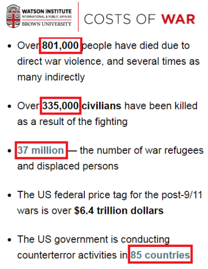 美国布朗大学“战争代价”项目研究发现,2001年以来,美国以“反恐”之名、花了6.4万亿美元在全球85个国家发动的战争和军事行动夺去了超过80.1万人的生命,其中平民超过33.5万人;多达3700万人在战乱中流离失所。