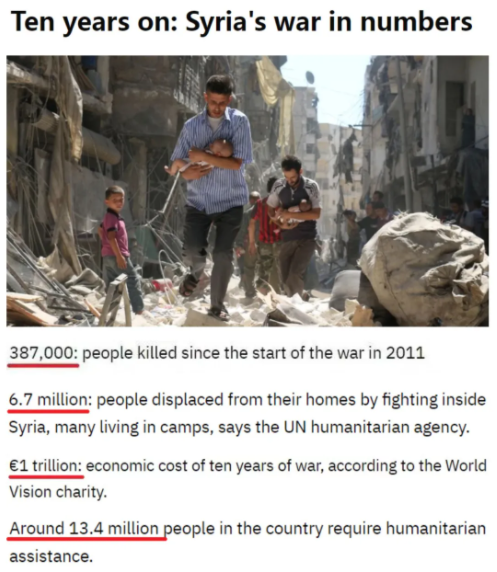 截至去年底,叙利亚危机已导致38.7万人死亡,670万人无家可归;经济损失估计高达1万亿欧元;约有1340万人需要人道主义援助。