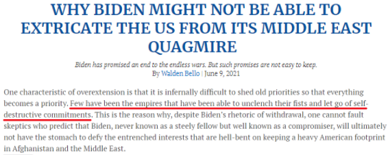在文章作者看来,美国在中东发动的长达20年的战争导致美国的“帝国权力”严重衰落,但即使是现在,很多人仍然怀疑美国是否真的吸取了教训,因为“很少有哪个帝国能够松开拳头,放弃自我毁灭的执念”。