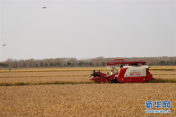 稻浪滚滚,满眼金黄。位于黑龙江省东部的七星农场万亩大地号,10多台大型收割机一字排开。