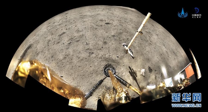 2020年12月4日,国家航天局公布了探月工程嫦娥五号探测器在月球表面国旗展示的照片。嫦娥五号着陆器和上升器组合体全景相机环拍成像,五星红旗在月面成功展开,此外图像上方可见已完成表取采样的机械臂及采样器。新华社发(国家航天局供图)