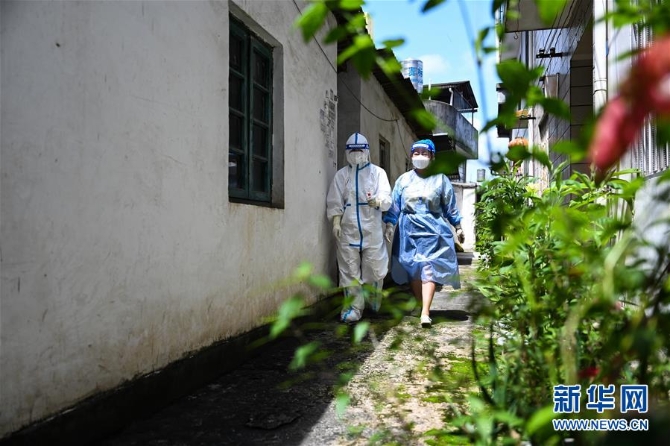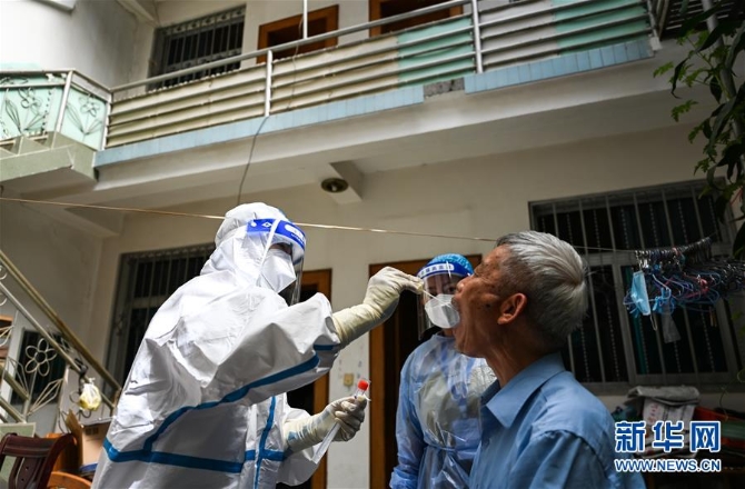 7月8日,友谊社区防疫人员入户为行动不便的老人进行核酸检测。新华社记者 王冠森 摄