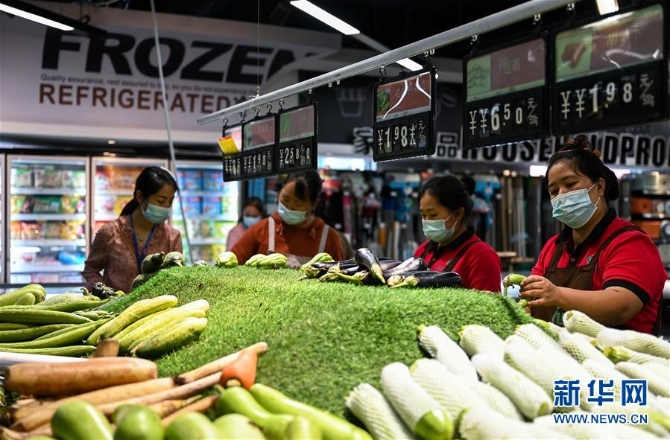 7月7日,工作人员在瑞丽一家超市整理货架。新华社记者 王冠森 摄