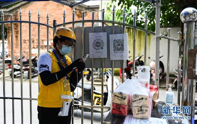 7月8日,外卖人员将食品送至预留点。新华社记者 王冠森 摄
