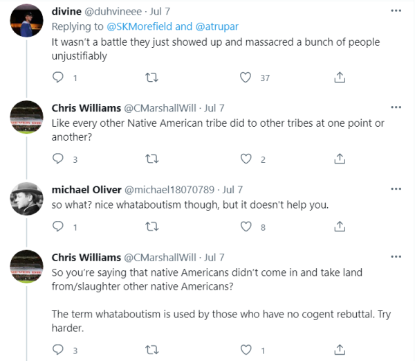 事实上,沃特斯在美国也确实有他的“市场”。比如在揭露沃特斯“暴露”的帖子下第一条评论反问:“他说错啥了吗?”、“原住民本来就自相残杀”,以此为白人的屠杀暴行辩护。