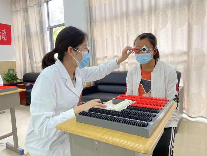 此次公益行动,普瑞眼科把裂隙灯、验光仪、直接眼底镜、眼镜插片箱等设备带到学校,不仅能帮助学生们检查视力问题,还可以进行眼病的初筛。上午9时许,学生们便有序地排队等候检查,“我以前从来没有检查过眼睛,上个学期看不清黑板,我自己在网上买了一副眼镜。”李同学通过测视力得知自己的裸眼视力仅为0.4,而此前在网上购买眼镜时,并未做过相应的医学验光检查,并不知道自己的近视情况。钱婷医生得知后,为李同学做了详细的电脑验光、眼镜插片等一系列检查,为李同学重新验配了一副适合自己的近视眼镜。