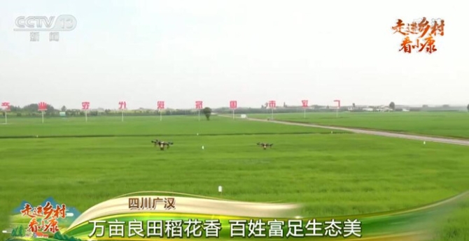 跟随镜头,我们现在来到的是四川广汉的锦花村粮食生产基地,万余亩水稻长势喜人,绿油油的水稻在微风的吹拂下此起彼伏,满目翠绿。眼下正值水稻病虫害防治的关键时期,农用植保无人机在技术人员的操作下来回穿梭,底部细细的水雾均匀地喷洒到了稻田里。