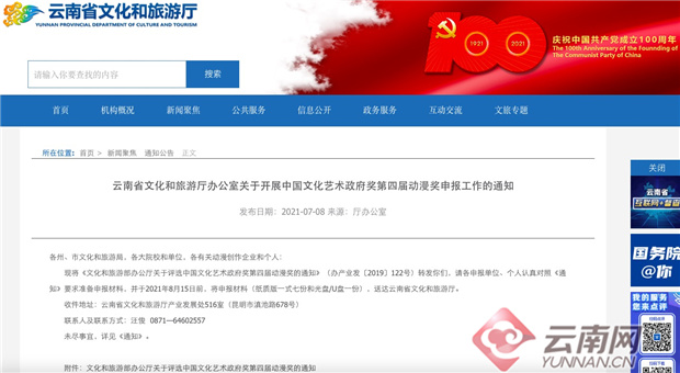 申报单位、个人可登录云南省文化和旅游厅官方网站,认真对照《通知》要求准备申报材料,并于2021年8月15日前,将申报材料(纸质版一式七份和光盘/U盘一份),送达云南省文化和旅游厅产业发展处。(云南网 记者毕芃)